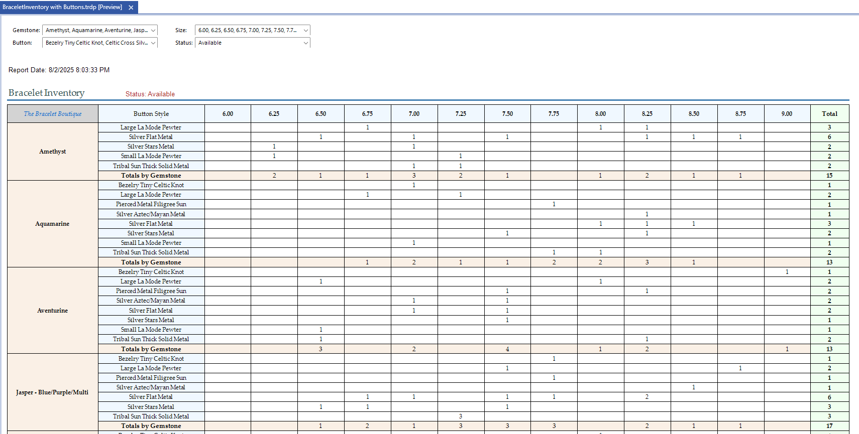 For this to report, the user can search by Bead (Gemstone), Bracelet Size, Button (I have a variety of fun buttons used for clasps) and Status (Available/Sold).
