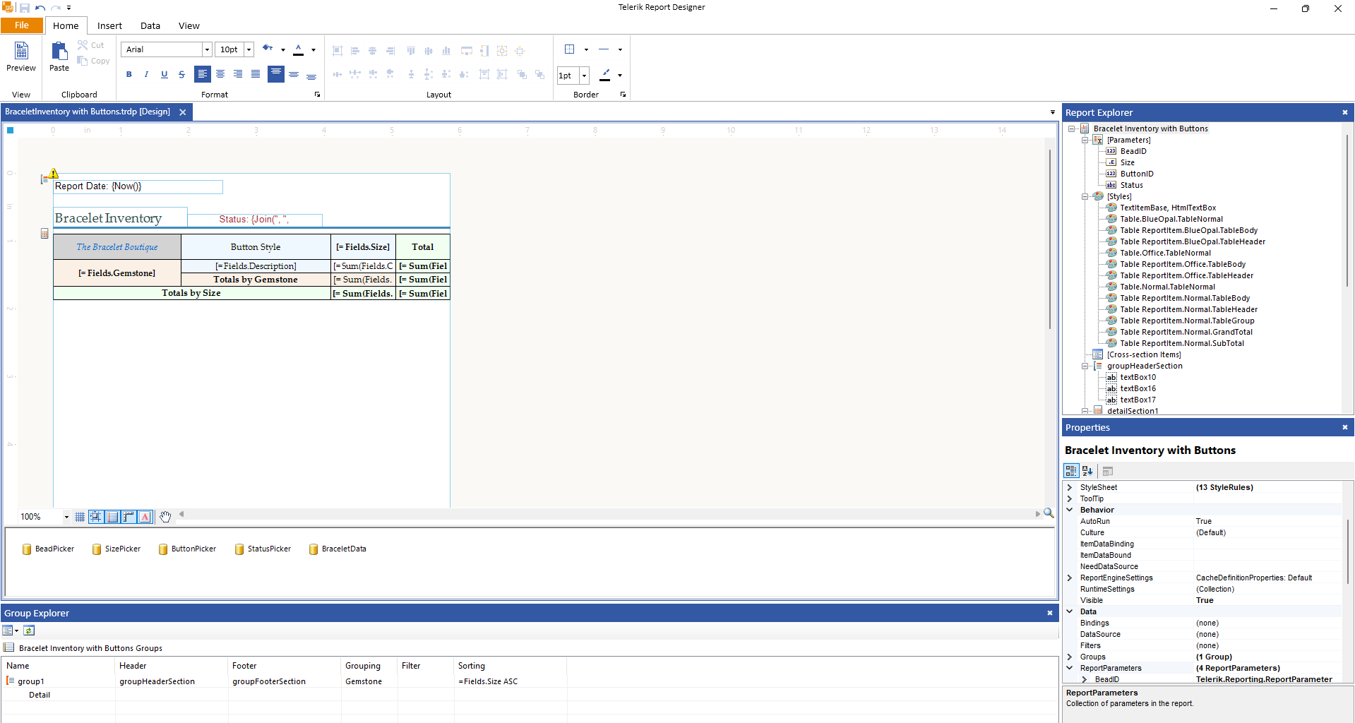 I was looking for a way to showcase my skills using SQL Server, SSMS and Telerik Report Designer. As luck would have it, I was also starting to make and sell leather and gemstone beaded bracelets. I created this database to keep track of supplies and costs as well as a crosstab report to track bracelet inventory.